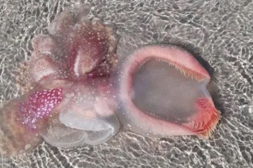 Makhluk misteri itu, berwarna merah jambu dan tembus cahaya, dilihat di perairan cetek di Pantai Urangan di Teluk Hervey, Queensland.