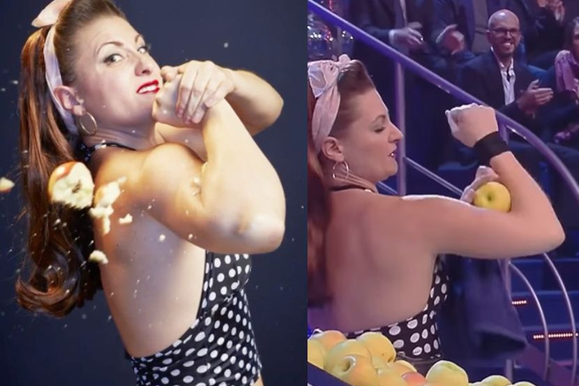 Menerusi video tersebut, Linsey Lindberg dilihat menghancurkan epal satu demi satu dengan cara mengepit buah tersebut pada otot lengannya sambil penonton bersorak.