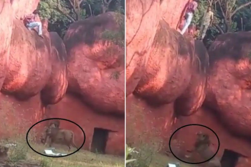 Kumar (berbaju merah) dilihat menunggu singa berkenaan beredar sebelum cuba menceroboh kandang haiwan berkenaan.