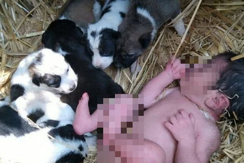 Seorang bayi baru lahir (kanan) selamat dalam jagaan sekumpulan anak anjing. foto Tahir Ibn Manzoor / SWNS