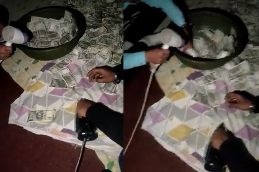 Sebuah video yang dikongsikan di media sosial menunjukkan pegawai jabatan berkenaan mengeringkan not wang kertas dengan menggunakan seterika dan pengering rambut.
