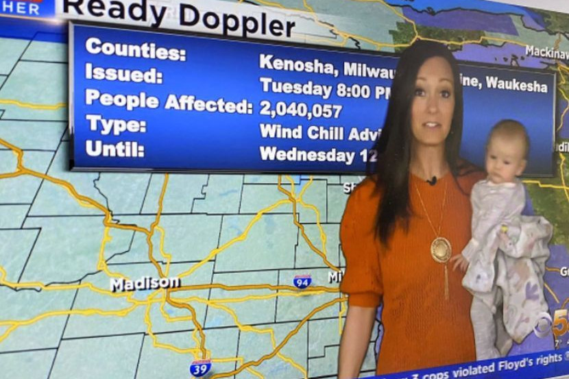 Rebecca Schuld, seorang penyampai berita dari Wisconsin, Amerika Syarikat, dilihat mendukung bayinya yang berusia tiga bulan ketika menyampaikan ramalan cuaca untuk CBS 58 News.