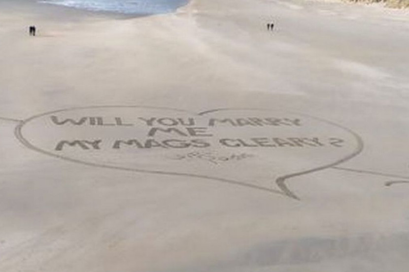 Teman wanitanya terkejut melihat mesej " Mags Cleary, sudikah awak berkahwin dengan saya?" yang terukir di atas pasir.