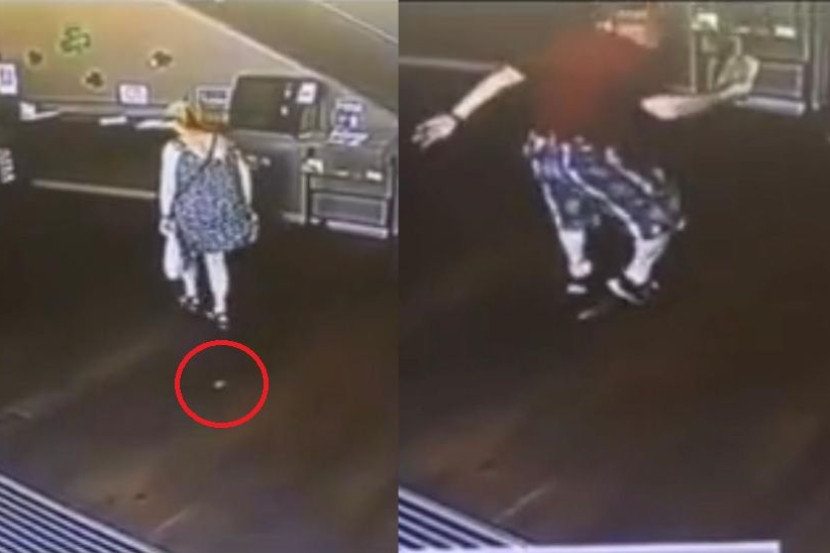 Beberapa detik kemudian, seorang lelaki yang masuk ke dalam kafe nyaris tergelincir selepas terpijak 'objek' tersebut.
