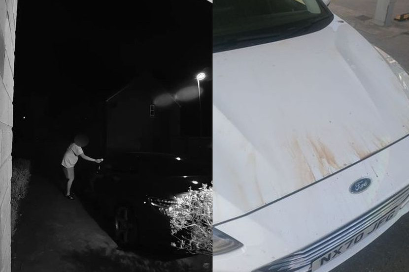 GELAGAT seorang lelaki yang melumur najis pada kereta baharu jirannya selepas menuang air kecil ke dalam peti surat rumah pasangan itu di Hampshire, England, berjaya dirakam oleh kamera litar tertutup (CCTV).