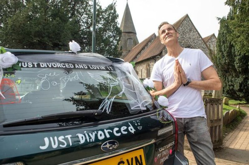 Seorang elaki menandakan berakhirnya perkahwinan lalu dengan memandu kereta berpelekat 'Just Divorced' di sekitar Dartford, Kent, Amerika Syarikat.