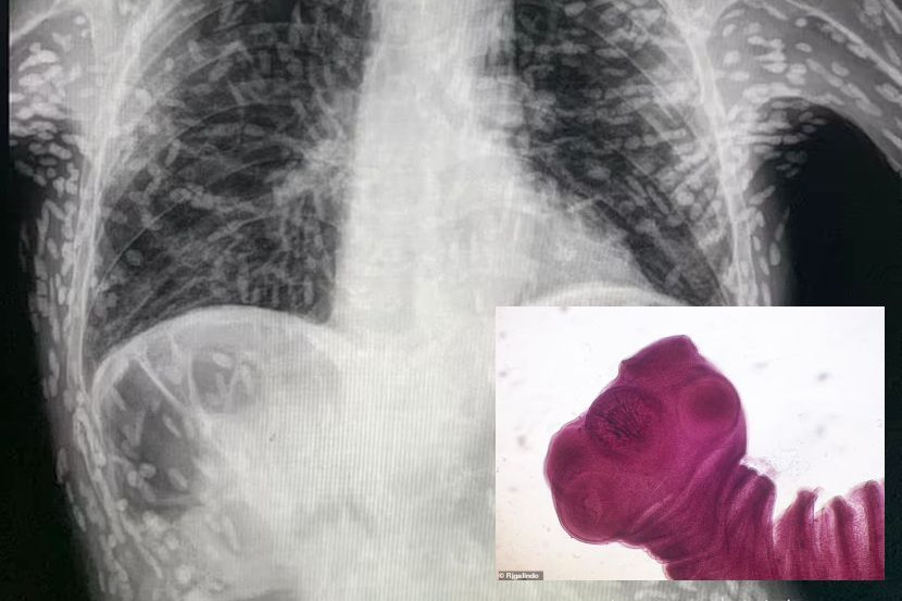 MENGEJUTKAN! Imbasan x-ray badan seorang pesakit yang kononnya mengalami batuk berterusan rupanya dipenuhi sisa berpuluh-puluh larva cacing pita.