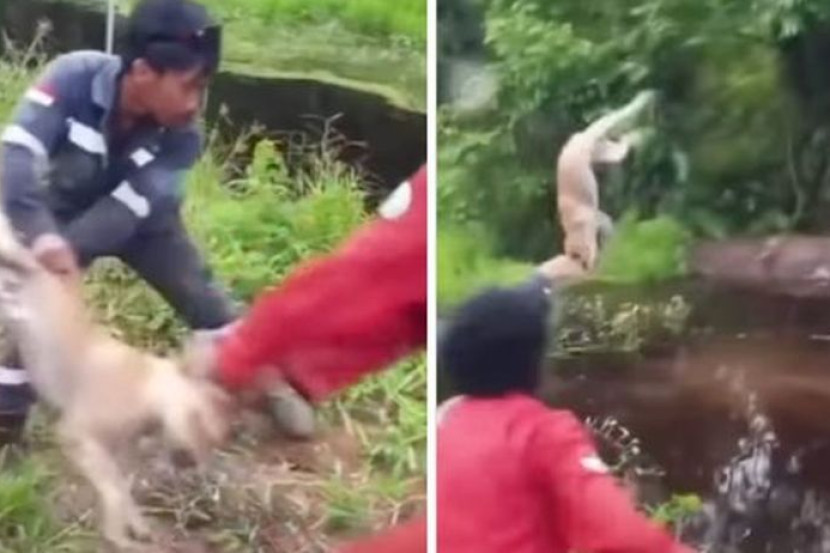 Menerusi video berdurasi sekitar 29 saat itu, kelihatan dua orang lelaki tersebut menangkap seekor anjing di tepi jalan, sebelum menghayun dan melempar haiwan itu ke dalam sungai.