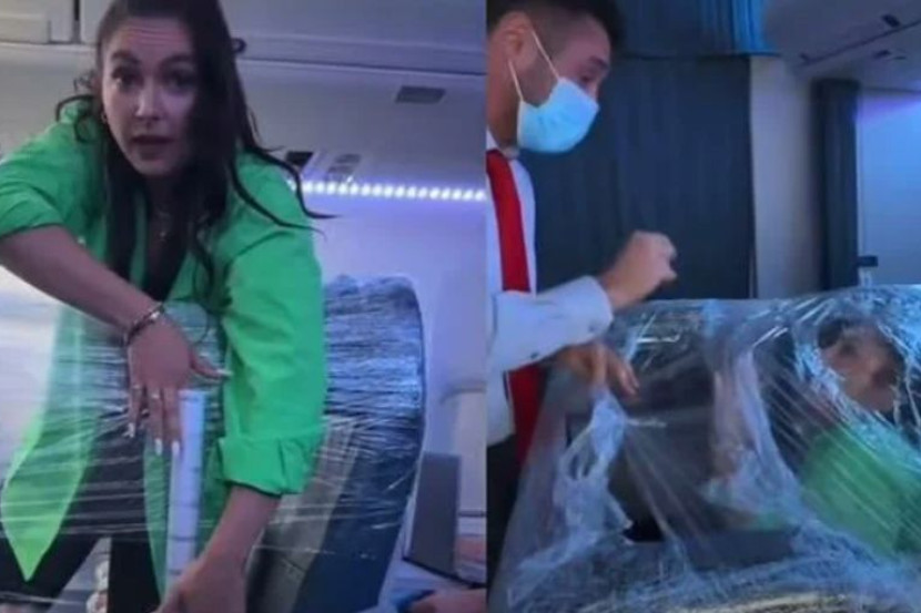 Akhirnya, seorang kru kabin menyedari tindakan wanita itu dan menyuruhnya menanggalkan semula pembalut plastik pada kerusinya.