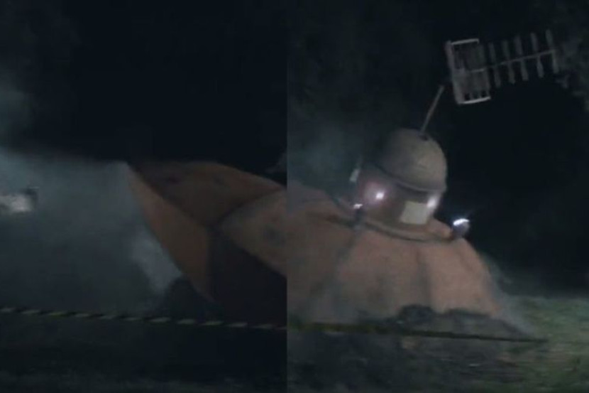 Turut kelihatan ialah beberapa orang berpakaian sut hazmat berada di lokasi UFO tersebut terhempas.