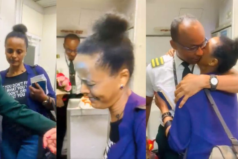 Menerusi rakaman video, wanita berkenaan bergerak ke sudut peribadi pesawat selepas dia diarahkan di mana anaknya sedang menunggu di sebalik tirai, sambil memegang sejambak bunga dan kek.
