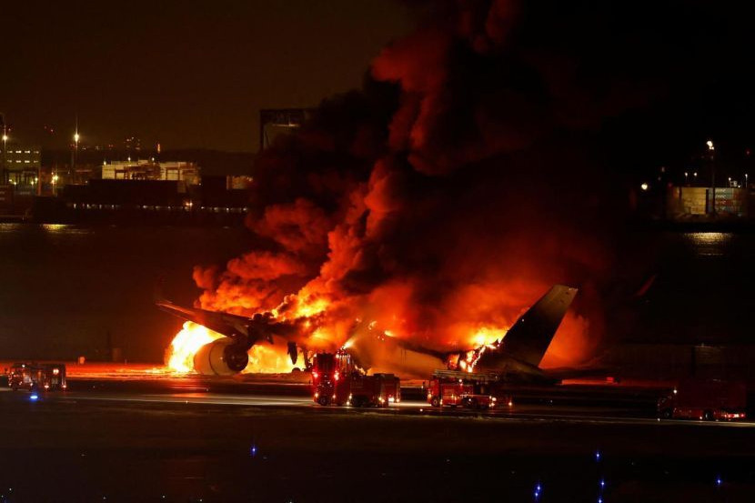 SEBUAH pesawat penumpang terbakar selepas bertembung pesawat pengawal pantai Jepun di landasan di Lapangan Terbang Haneda Tokyo pada hari Selasa.