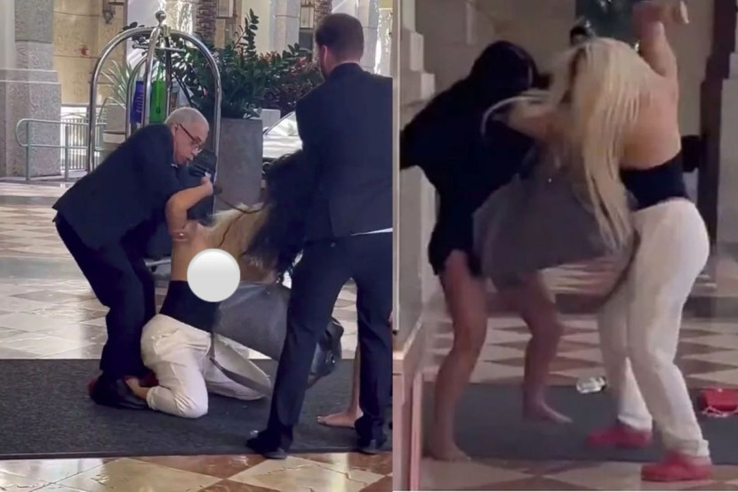 Turut kelihatan seorang pekerja hotel cuba untuk membantu ketika mereka saling bertumbuk dan menarik rambut masing-masing.