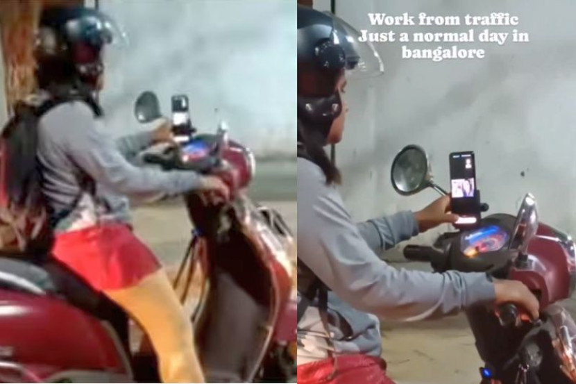 Seperti video tular, seorang wanita dari Bengaluru yang sedang menunggang motosikal jenis skuter dirakam ketika sedang menyertai mesyuarat online.