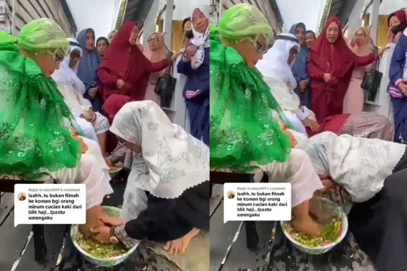 Menerusi video yang dikongsikan di laman TikTok, kelihatan beberapa wanita mencuci muka dan meminum air basuhan kaki jemaah yang baru pulang mengerjakan haji.