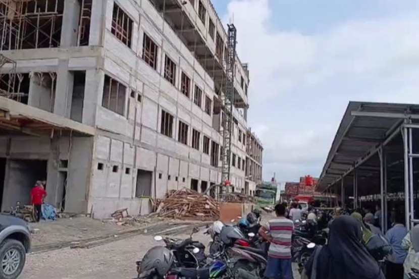 Penduduk tempatan mengerumuni lokasi kejadian yang mengorbankan tiga pekerja di tapak pembinaan Hospital Kemajuan Kebajikan Masyarakat (RS PKU) Muhammadiyah Blora. -Foto iNews