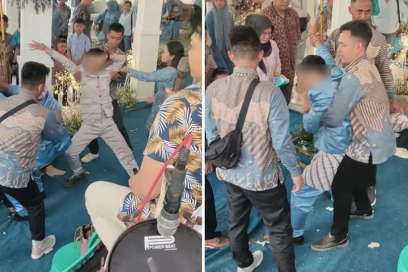 Tetamu dan ahli keluarga cuba menenangkan bapa dan anak saudara pengantin perempuan yang kerasukan ketika menari. -Foto TikTok @mang_heri_channel