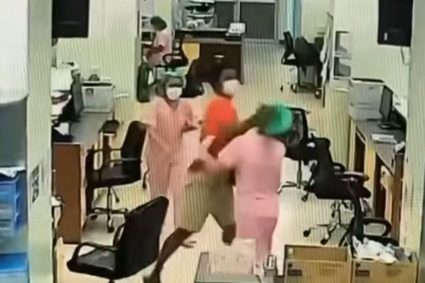 Rakaman itu menunjukkan seorang lelaki yang memakai kemeja-T berwarna oren dan berseluar pendek bercakap dengan jururawat, sebelum menamparnya dua kali.