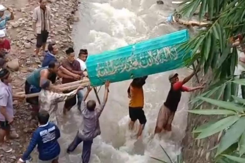 Tangkap layar (screenshot) memaparkan penduduk kampung sedang bertungkus-lumus menyeberangi sungai sambil mengusung keranda. -Foto Detik