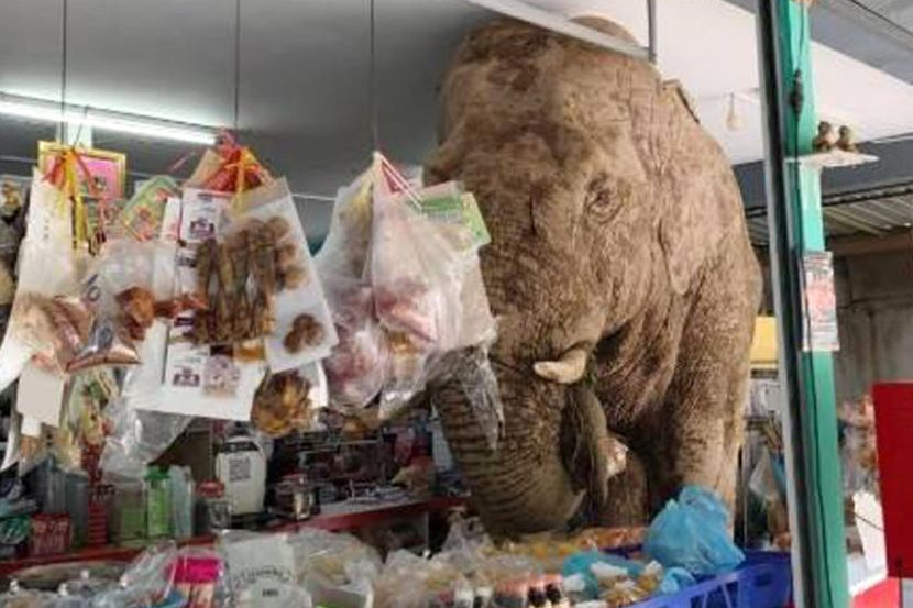 Menerusi gambar yang dikongsikan, tulang belakang gajah itu hampir menyentuh siling stor kedai berkenaan.