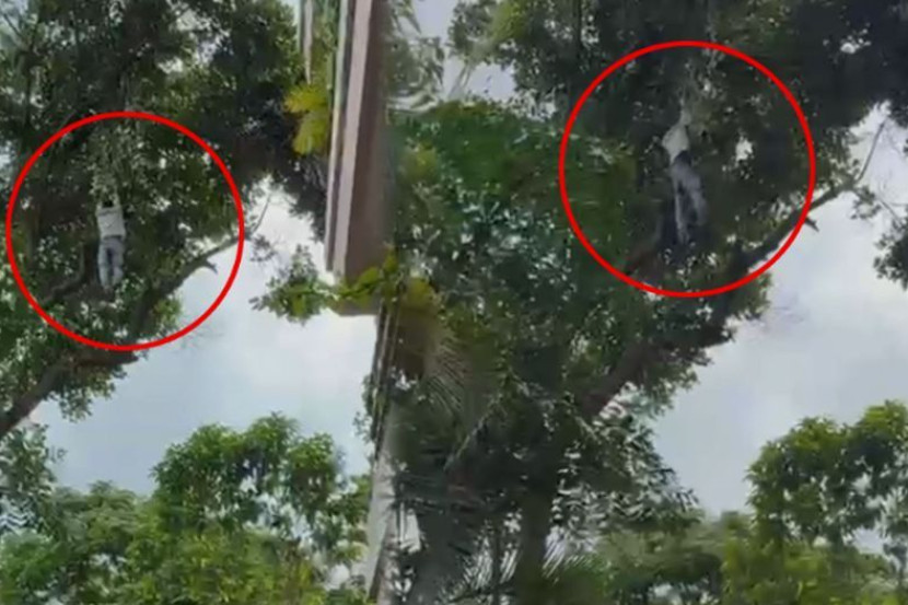 Malangnya, dia tergelincir dan tergantung pada dahan pokok sambil berusaha bertahan demi menyelamatkan nyawa.