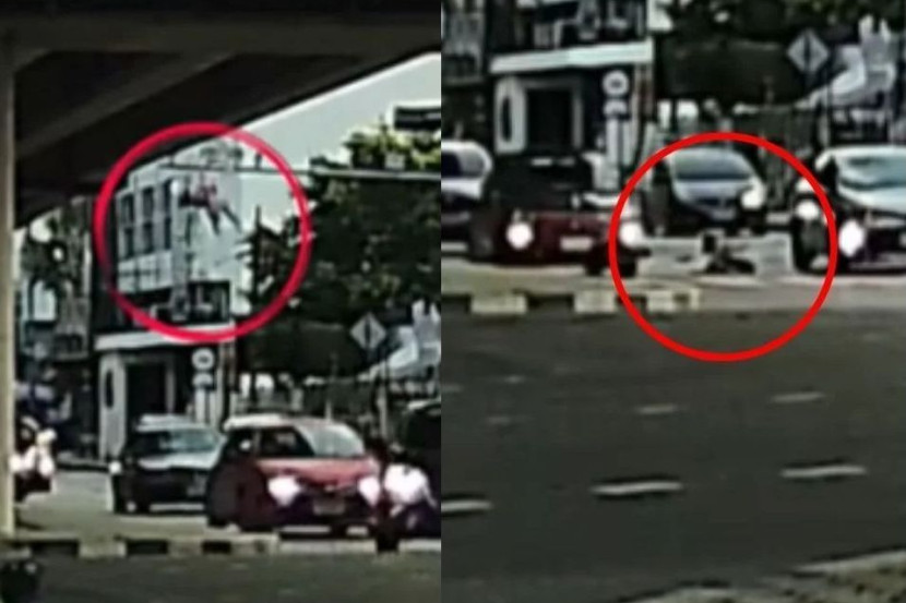 Menerusi perkongsian netizen [Tonton Video] di media sosial, mangsa dilihat terjatuh ke atas bumbung sebuah kereta selepas dia tercampak dari jambatan.