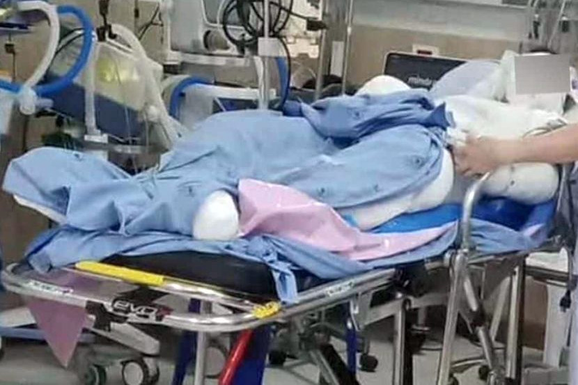 Foto terkini keadaan mangsa yang berbalut kain kasa di seluruh badan turut dimuat naik ke Facebook.
