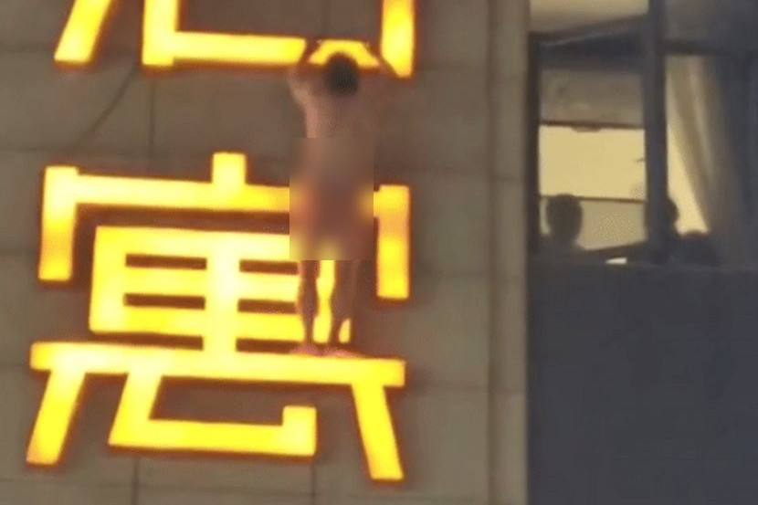 Lelaki tersebut dikatakan memanjat dinding luar hotel sehingga berjaya memaut papan tanda pada bangunan berkenaan.