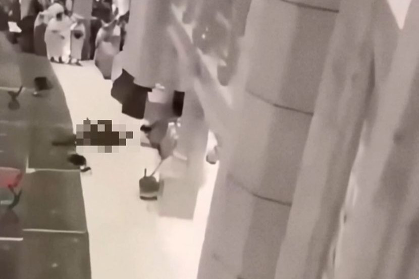 Menerusi rakaman tular, jemaah itu kelihatan jatuh di atas seorang anggota keselamatan yang cuba menyelamatkannya dari aras bawah.