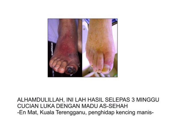 Sebagai testimoni, salah seorang penghidap kencing manis yang hanya ingin dikenali sebagai Encik Mat dari Kuala Terengganu mengakui keberkesanan produk madu asli ini dalam menyembuhkan luka pada kakinya, terutama kuku ibu jari kaki kanannya.