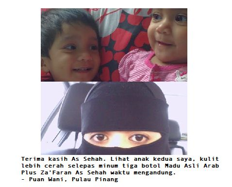 "Terima kasih As Sehah. Lihat anak kedua saya, kulit lebih cerah selepas minum tiga botol Madu Asli Arab Plus Za'Faran As Sehah waktu mengandung," katanya.