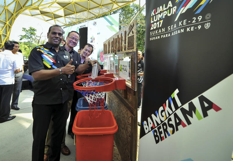 Timbalan Menteri Belia dan Sukan Datuk M Saravanan (kiri) meletakkan pembungkus makanan ke dalam tong sampah kitar semula bagi menyempurnakan program "Bin It Right" pada Majlis Pelancaran Inisiatif Hijau KL2017 di Taman Botani Perdana, baru-baru ini. Turut hadir Ketua Pegawai Eksekutif Jawatankuasa Pengelola Malaysia (MASOC) Datuk Seri Zolkeples Embong (dua, kiri) dan Pengerusi Kumpulan SCGM Berhad, Datuk Seri Lee Hock Seng (tiga, kiri).