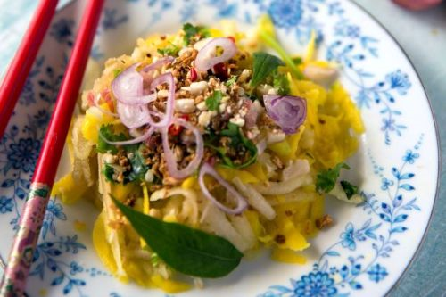 - Gaulkan hirisan mangga, epal, bunga kantan, daun kesum, bawang merah dan cili burung.