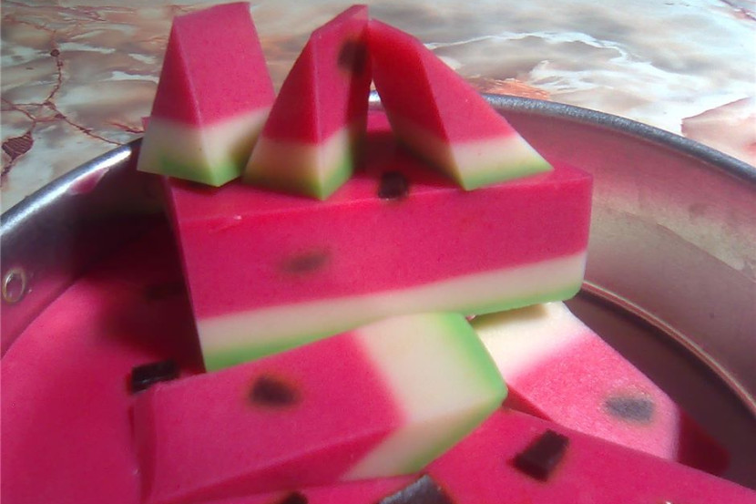 Dalam bekas lain, ambil sedikit adunan dan masukkan pewarna hijau sebagai kulit tembikai. Masukkan ke dalam loyang. Biarkan beku sedikit. Seterusnya, masukkan adunan tanpa pewarna ke dalam loyang dan biarkan beku sedikit.