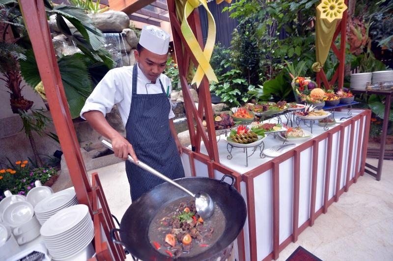 Tanpa menyisihkan hidangan kambing bakar yang menjadi sajian wajib hotel tersebut setiap tahun, terdapat juga aneka puding, kuih-muih seperti badak berendam dan bubur cha cha citrawarna sebagai pencuci mulut.