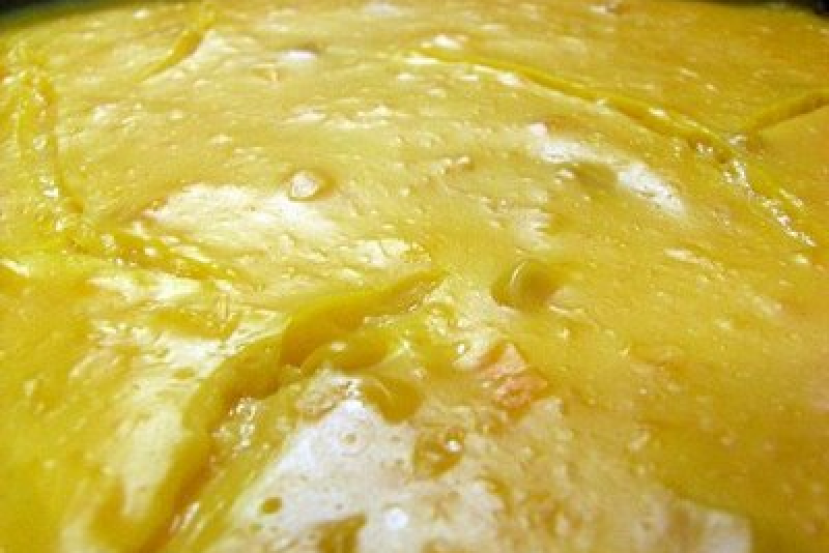 Campurkan tepung kastard, gula, jagung dan pati santan. Lepas itu dikacau hingga pekat dan berkilat atas api sederhana hingga sebati. Lepas itu angkat dan sejukkan di dalam loyang.
