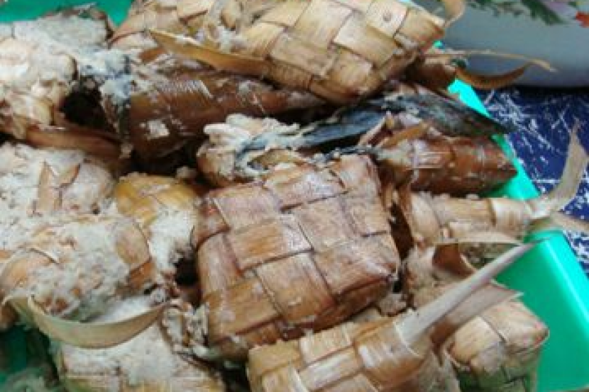 Matikan pangkal sarung ketupan supaya tidak terkeluar isinya bila diisikan dengan pulut, matikan hujung dan setelah siap boleh diisikan dengan pulut hingga 3/4 sarung.
