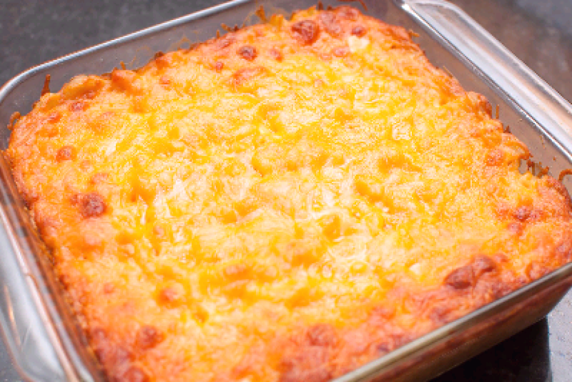Makaroni yang direbus ditoskan, kemudian masukkan dalam bekas yang bersih. Masukkan bahan daging yang dimasak ke dalam bekas bersama makaroni dan gaul rata. Tambah cheeddar cheese yang diparut sebelum dimasukkan ke loyang pembakar.