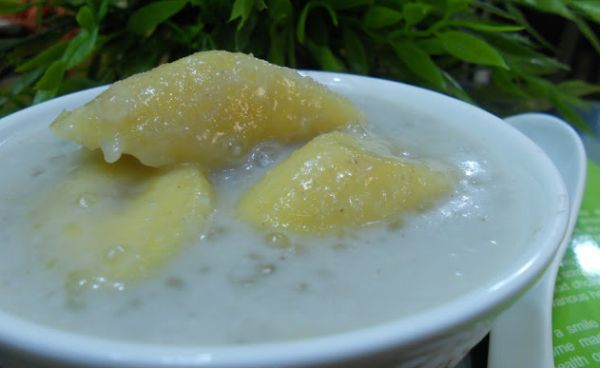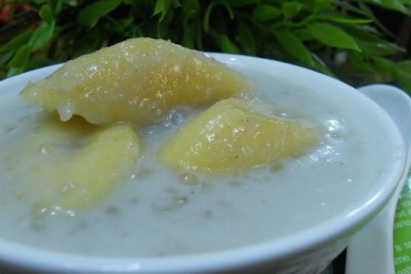 Masak sehingga mendidih dan pisang empuk. Kemudian masukkan santan dan sagu biji. Kacau rata.