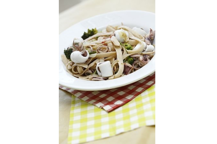 2. Masukkan sotong dan pasta. Taburkan sedikit garam.