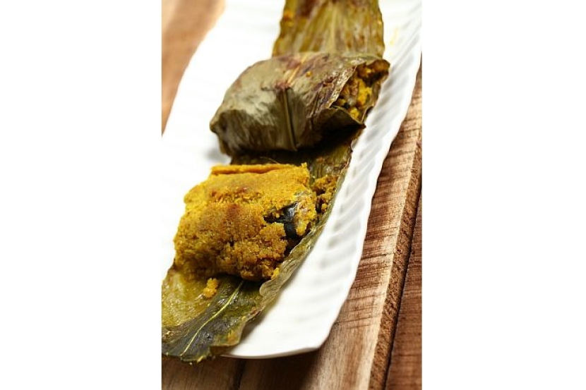 2. Setelah masak, letak di atas ikan dan bungkus dengan daun pisang.