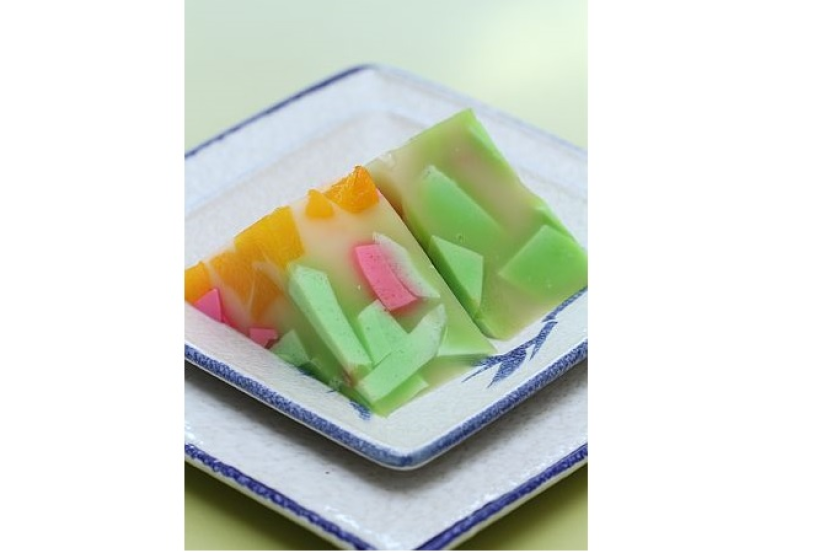 5. Satukan bahan C dan masak sehingga mendidih. Tuangkan ke dalam loyang berisi agar-gara berwarna dan buah.
