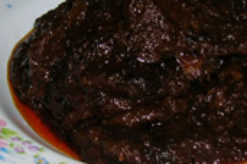 Rebus daging, cili giling, kicap, buah kurma dan prun hingga daging masak.