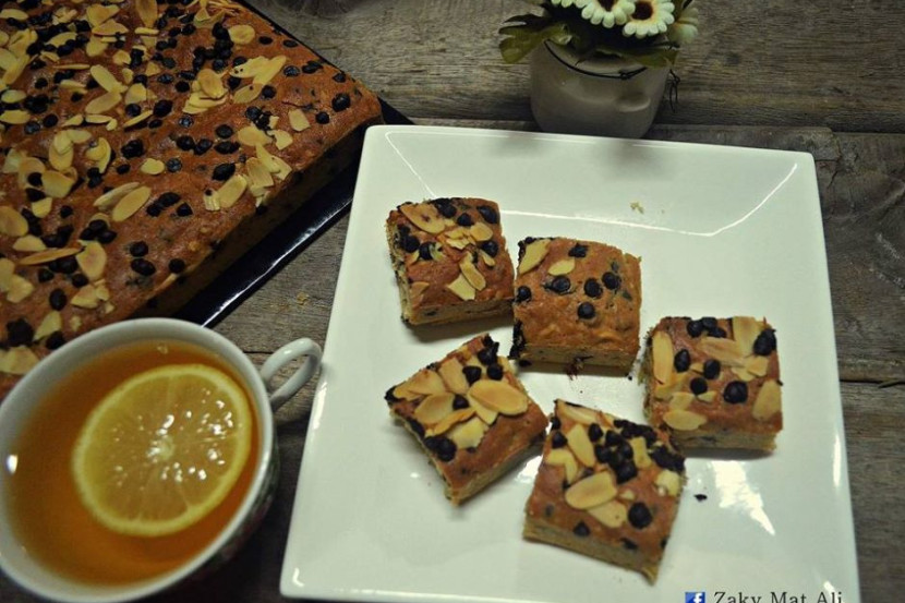 - Tuangkan adunan kedalam bekas 9 X 9 yang telah dialas dengan ‘baking paper’. Tabur Coklat Cip dan Badam Keping.