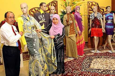 Sambil memegang sehelai kain samping bermotif ‘baroque’ dwi warna -- coklat muda dan gelap.