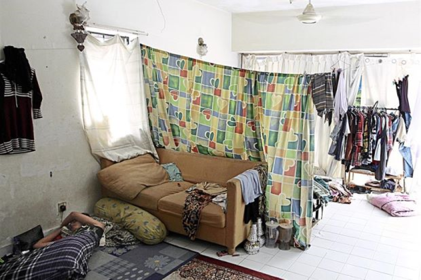 Sebahagian pekerja asing yang tidur di ruang tamu dengan beralaskan bantal, dan menjadikan sepanduk sebagai tempat tidur.