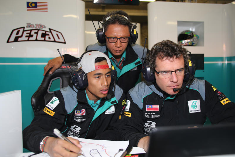 Hafizh, Barry (belakang) dan ketua mekanik, Albert Floriach sedang meneliti trek sebelum perlumbaan.