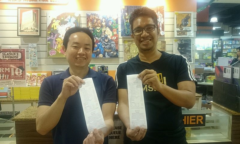 Andrew Yap (kiri) dan Amir Muhammad menunjukkan resit pembelian buku yang dicetak dengan cerita terpilih.