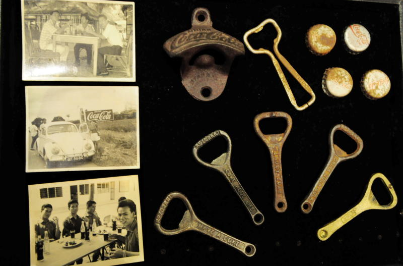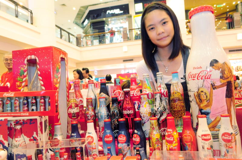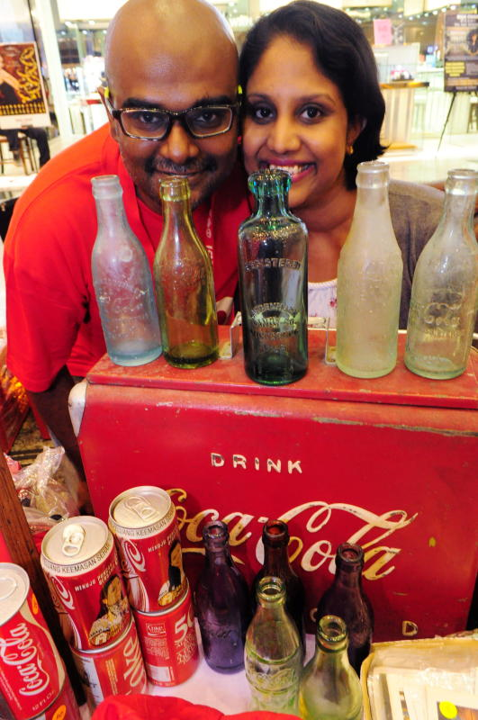 Pengumpul dari Malaysia, Paul dan Sherline Ann Velanganny (gambar bawah) menunjukkan koleksi lima botol klasik Coca Cola yang dihasilkan pada tahun 1886 ketika minuman itu dijual di Atlanta, Georgia buat pertama kali.