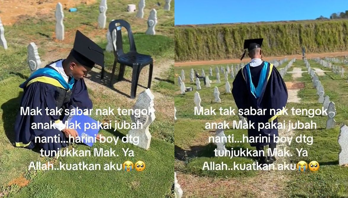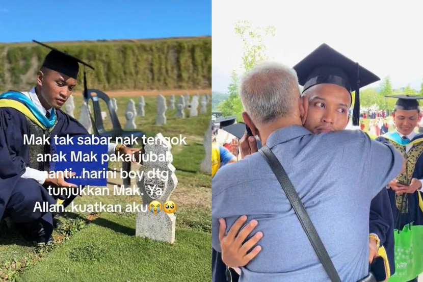 SEORANG graduan Universiti Pendidikan Sultan Idris (UPSI) tular selepas dia menziarahi Tanah Perkuburan Islam Sungai Petani, Kedah dengan memakai jubah konvokesyen. Menerusi video yang dikongsi pada Khamis, Muhammad Kamal Salmi, 27, dilihat berjalan di kawasan kubur sebelum dia mengusap batu nisan di pusara ibunya, Allahyarham Noraini Yusof. Menurut Kamal, dia berkunjung ke kubur sambil memakai jubah konvokesyen sebagai simbolik untuk meraikan hari bermakna itu meskipun ibunya sudah lama tiada. Kamal menunaikan 'janji' untuk meraikan hari bahagia itu dengan ibunya. "Dah lama saya nantikan hari terindah untuk menamatkan pengajian. Saya juga dah lama berniat dalam hati untuk menunjukkan jubah kepada mak serta bawa scroll sebagai tanda penghargaan atas pengorbanannya. "Tapi apakan daya, hasrat saya untuk menyarungkan jubah kepada mak tidak kesampaian. Tapi saya yakin mak nampak dan gembira dengan kejayaan saya. Saya dapat rasakan perasaan sedih ketika itu. "Saya berjalan ke pusara lengkap dengan mortar board dan scroll ijazah saya. Sememangnya saya dah berjanji dengan diri, tamat saja graduasi saya akan cari masa untuk ke pusara mak, 'tunjukkan' pada mak," ujarnya kepada mStar. Mak selalu cakap, anak mak pasti berjaya satu hari nanti... mak nak sangat tengok anak mak pakai jubah tu. MUHAMMAD KAMAL SALMI Menurut graduan bidang Pengajian Malaysia dengan Pendidikan itu, ibunya meninggal dunia akibat kanser sarkoma pada 4 September 2021. Lebih memilukan, ibunya menghembuskan nafas terakhir ketika Kamal sedang menjalani semester kelima pengajian, sekali gus memberi kesan emosi yang cukup berat buatnya. "Mak meninggal semasa saya dalam pengajian iaitu pada semester lima ketika saya menjalani Latihan Mengajar di sebuah sekolah di Kedah. Mak meninggal akibat kanser sacorma. "Sepanjang pengajian, saya memang ingat pesan mak. Mak nak sangat saya berjaya dunia akhirat. Dia minta jangan lupa asal-usul. Setinggi mana kita berada, tolonglah sesiapa yang memerlukan. ARTIKEL BERKAITAN: Pelajar tak teruja hadir konvo, tapi “Saya hadiahkan mereka Anugerah Naib Canselor” ARTIKEL BERKAITAN: [V] Anak ziarah pusara ibu pakai jubah konvo, imbas memori di beranda hospital... “Mulut kata reda, tapi tak mudah hidup tanpa dia” "Mak selalu cakap, anak mak pasti berjaya satu hari nanti. Mak nak sangat tengok anak mak pakai jubah tu. Berjaya macam orang lain dan berjaya dalam bidang pengajian sebagai cikgu," ujar anak keempat daripada lima beradik itu. Ketika majlis graduasi pada 28 November lalu, Kamal diraikan oleh bapanya Salmi Ismail serta ahli keluarga yang lain. Menerusi satu video berasingan yang dikongsi di TikTok, Kamal juga dilihat sebak ketika dia memeluk bapanya selepas tamat majlis tersebut. Kisah Kamal meraih perhatian ramai selepas video dia ke kubur tular di TikTok. Di ruangan komen, ramai netizen turut menitipkan ucapan tahniah buat Kamal serta berharap dia terus kuat untuk meneruskan kehidupan dan bergelar guru tidak lama lagi. "Tahniah dik. Ibu adik pasti bangga dengan kejayaan adik. Kuatkan semangat ya. "Tahniah. Ibu tinggal harta berharga untuk adik iaitu ilmu. Semoga terus tabah. "Mak kita tak pernah hilang. Cuma hilang daripada pandangan mata saja," tulis beberapa netizen di TikTok. Jadilah sebahagian daripada geng mStar! Follow kami di Telegram, Twitter, TikTok, Facebook, Instagram dan YouTube